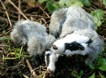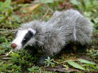 Passend zu den Tieren aus "Der Wind" in den Weiden " habe ich auch Dachse gemacht. Sie haben eine Schulterhöhe von 4 bzw. 2 cm und sind aus viskoseähnlichem Stoff. In addition to the animals from "The wind in the willows" I made these badgers. They are 1 3/4" and 1" high . |
