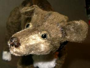 | The picture above shows Diana, a Spanish mixed breed, only few weeks before she died. I had taken some photographs of her which later helped me to do the portrait dog. Diana is unjointed and made from viscose, shoulder height around 5". Diana features eye lids made of thin velours and the nose is also moulded with this fabric and varnished then. | |