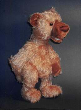 Grobi got his name as he reminds me of the monster in "Sesame Street". He also was made to show some bearmaking techniques: an open mouth with lips in a broad snout, stitching a large nose, designing and making a double neck joint and arms with jointed ellbows. His paws and soles feature the trapunto version. |