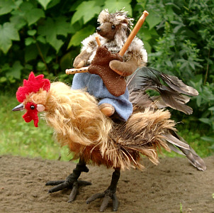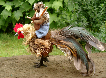 Der verwunschene Held des Märchens ist halb Igel, halb Mensch, der mit seinem Dudelsack auf einem Hahn in die Welt reitet, um sein Glück zu machen. Hans ist 10 cm groß, ein "Teddytier" aus Mohair und Miniplüsch und 5fach gegliedert. Der Hahn hat eine Schulterhöhe von 13 cm, er ist ungegliedert, aber voll beweglich und aus Mohair sowie echten Federn gemacht. |