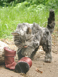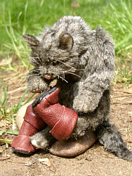 Er ist ein "Teddy-Tier" und etwa 25 cm groß. Nach 10 Jahren habe ich das Thema noch einmal aufgegriffen. Dieses Mal habe ich versucht, den Kater sehr realistisch zu gestalten. Solange er auf vier Beinen läuft, ist er eine ganz normale Katze, doch mit den Stiefeln an den Füßen wird er zum listigen Märchenheld. In 1993 "Puss in Boots" was our second play we performed with our puppet theater. The cat on left is a small version (10") of our theater
