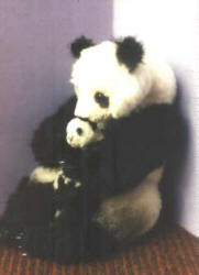 bekommen ist. Die Pandamutter rechts entstand im Frühsommer 1997, Pixiu und ihr Baby Mo habe ich im Herbst desselben Jahres gemacht. Sie sind aus Alpaka und 10 und 30 cm groß.