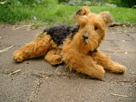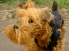 | This Welsh Terrier is a portrait dog too. He is made of mohair and alpaca, shoulder height 5". Although unjointed the dog is as poseable as my other animals. | |