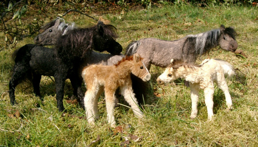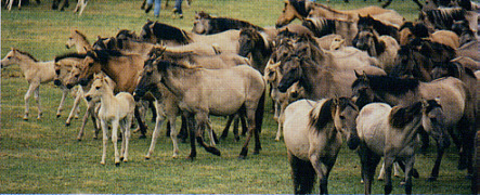 Hier ist meine kleine Wildpferdegruppe: Morrigan , die Rappstute, ist möglicherweise ein echtes Wildpferd, obwohl Stuten die Wildbahn nur sehr selten verlassen. Schwarze sind unter den Wildlingen nicht so selten, aber Füchse wie die kleine Elora werden dort in den letzten Jahren nicht mehr geboren, seit die Zucht in erster Linie von polnischen Konikhengsten beeinflusst wird. |