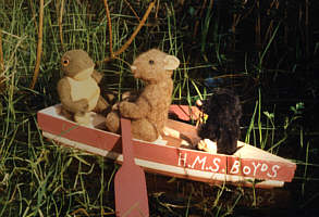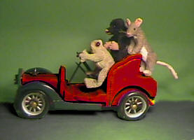 The heroes of "The wind in the willows" in the first row are fully jointed and from 3 to 4" tall. They were nominated for TED worldwide in 1999. The three friends in the red car are a little bit smaller. The second row shows two other sets in miniature size. You will find the badger in another page. |