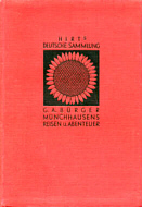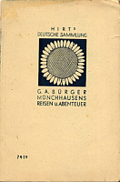Des Freiherrn von Münchhausen Reisen und Abenteuer. Breslau (Königsplatz 1): Ferdinand Hirt, 192~ [Hirts Deutsche Sammlung - Literarische Abteilung, Gruppe V (Schwänke, Fabeln und Volksbücher) Band 1] Leinenband; Format 13 x 18,8; 64 Seiten Nach der deutschen Übersetzung Gottfried August Bürgers neu bearbeitet und mit einer biographischen Ergänzung versehen von Hugo Jessat Mit dem Bilde des Dichters nach einem Stich von Friedrich Bolt und 10 Zeichnungen von Theodor Hosemann Druck von Frankenstein & Wagner in Leipzig Deutschland [SCH 192_/29 |