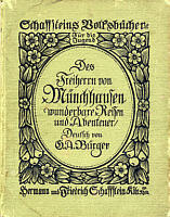 Köln am Rhein: Hermann Schaffstein, 1921 [Schaffsteins Volksbücher Band 16] 13tes bis 15tes Tausend Halbleinenband; Format 15,9 x 20,6; 78 + 2 Seiten Vorrede von Wilhelm Spohr 1905 Deutsch von Gottfried August Bürger. Bearbeitet von Gaup. [Als Bearbeiter in der Liste der Volksbücher am Ende des Buchs aufgeführt.] Mit farbigen Bildern von J. von Diveky Einband von C. Joh. Köhler [Buchausstattung von E. R. Weiß] Gedruckt in der Roßberg'schen Buchdruckerei, Leipzig. Deutschland [SCH 1921/01] |