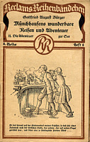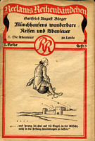 wunderbare Reisen und Abenteuer. I. Die Abenteuer zu Lande Leipzig: Philipp Reclam jun., 1923 [Reclams Reihenbändchen 2. Reihe, Heft 3] Heft; Format 9,9 x 15,5; 32 Seiten [Titelbild von Bohn] Druck von Philipp Reclam jun. Leipzig Die vorstehenden Landabenteuer Münchhausens sind aus Reclams Universal-Bibliothek Nr. 121/21a entnommen. Deutschland [SCH 1923/12] |