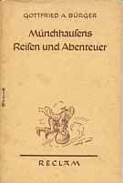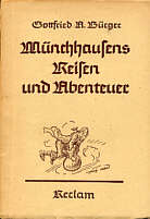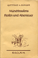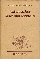 Bürger: Münchhausen Reisen und Abenteuer. Des Freih. v. Münchhausen wunderbare Reisen und Abenteuer zu Wasser und zu Lande, wie er dieselben bei einer Flasche im Zirkel seiner Freunde zu erzählen pflegte. Leipzig: Verlag von Philipp Reclam jun., 1947 [Reclams Universal-Bibliothek 121.121a] Broschur; Format 9,6 x 15,8; 143 Seiten Nebst einem Anhang Lügengeschichten aus älterer Zeit [mit Einleitung von Dr. Max Mendheim ohne Angabe des Verfassers] [Titelbild von Fritz Fischer] Gesetzt aus der Breitkopf-Fraktur (M112) Philipp Reclam jun. Leipzig Nr. 2148. Lizenz Nr. 39 Deutschland [SCH 1947/11] |