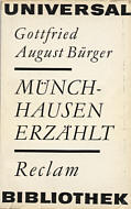 Wunderbare Reisen zu Wasser und Lande, Feldzüge und lustige Abenteuer des Freiherrn von Münchhausen. Wie er dieselben bei der Flasche im Zirkel seiner Freunde selbst zu erzählen pflegt. Leipzig: Verlag Philipp Reclam jun., 1981 [Reclams Universal-Bibliothek 121] [Verlags-Nr. 660 071 4] 6. (recte 7.) Auflage Taschenbuch; Format 10,6 x 17,6; 99 + 4 Seiten Textkritisch bearbeitet und mit einem Nachwort von Curt Noch Text nach: Wunderbare Reisen zu Wasser und Lande, Feldzüge und lustige Abenteuer des Freyherrn von Münchhausen, wie er dieselben bey der Flasche im Zirkel seiner Freunde selbst zu erzählen pflegt. London (Göttingen) 1786: und nach der zweiten, vermehrten Ausgabe, London (Göttingen) 1788 Mit 16 Illustrationen von Renate Totzke-Israel © Reclam-Verlag Leipzig 1981 - Reihenentwurf: Irmgard Horlbeck-Kappler - Gesetzt aus der Garamond-Antiqua - Printed in the German Democratic Republic 1981 - Lizenz Nr.363.340/25/81 LSV 7101. Vbg. 5,6 - Gesamtherstellung: Grafischer Großbetrieb Völkerfreundschaft Dresden DDR [SCH 1981/06 |